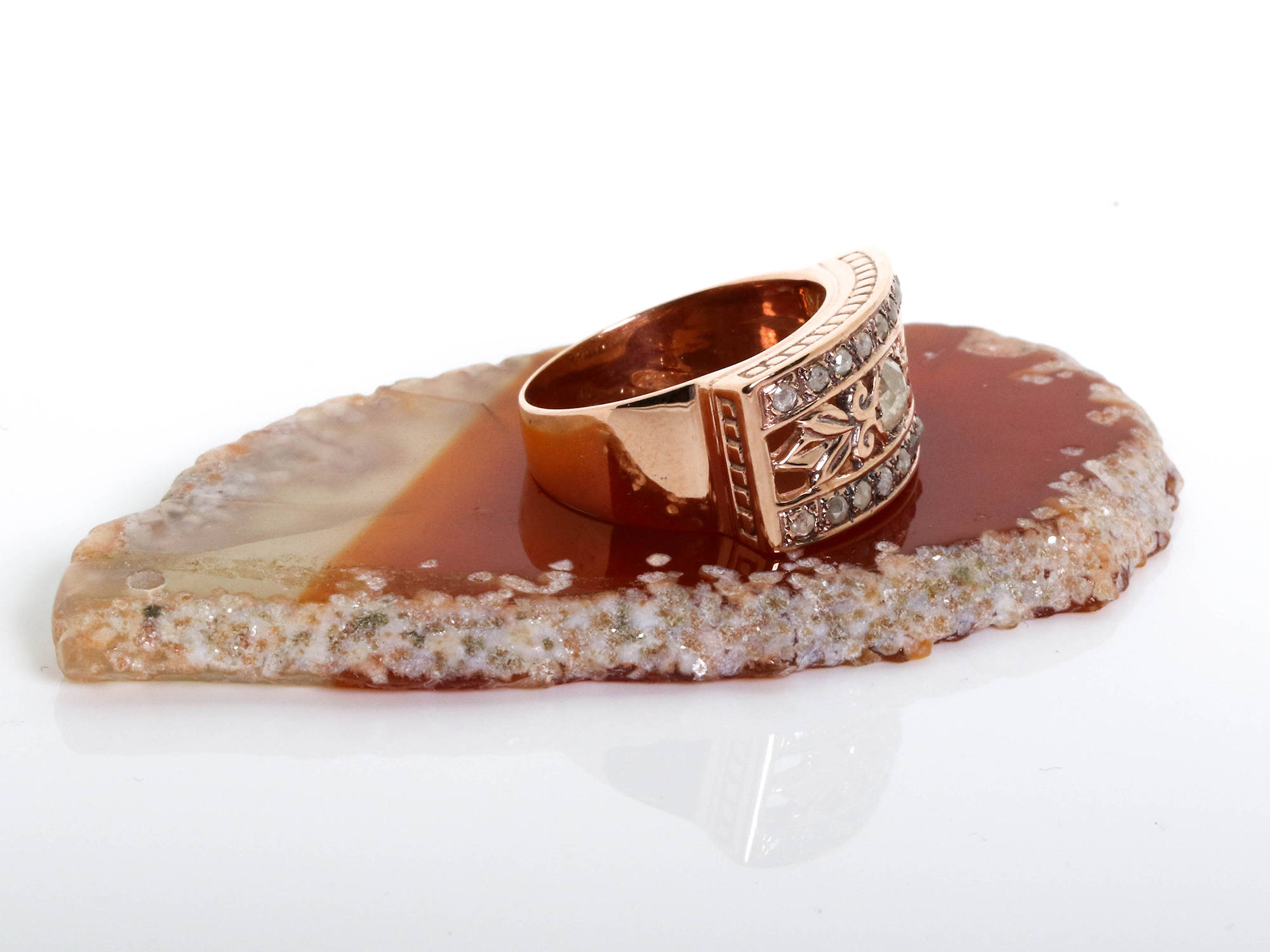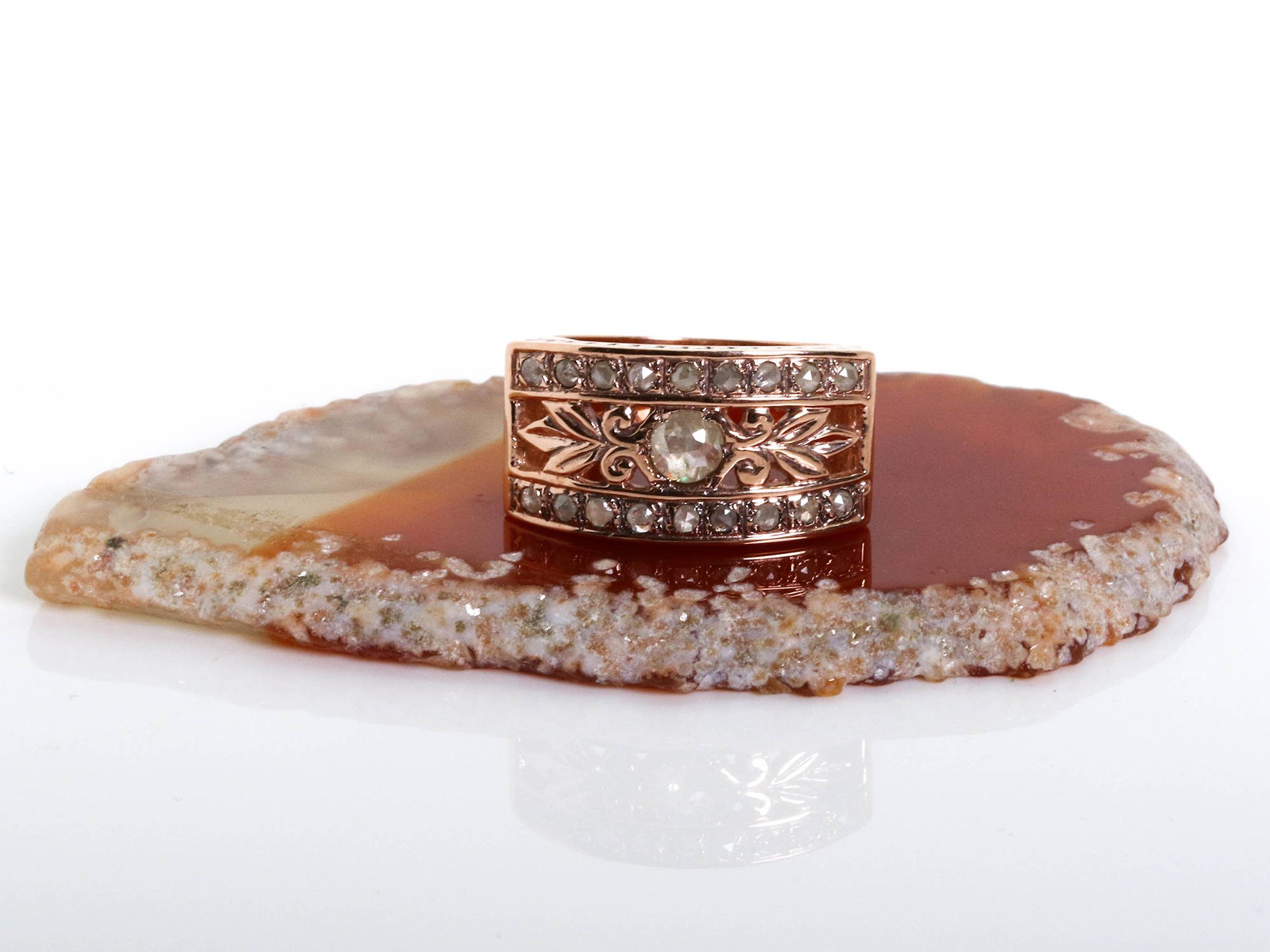 טבעת סרט זהב אדום משובץ יהלום מרכזי ו2 שורות יהלומים
